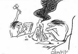 Uno esperaría encontrar en el actual eslabón de una cadena, no completada, ¡seguro!, algo más “perfeccionado”. Más digno de una tan larga espera, al final del proceso que había desembocado en nuestros días presentes. Pero, ahí estaba. Esa privilegiada posición estaba re-presentada por nuestro científico “puturrú-de-fuá”. Calvo, canoso en sus sienes, barrigón y con gafas, eso sí, con un toque muy intelectual. Con una piel tan blanca y delicada que la más mínima corriente de aire resfriaría. Gesticulando con manos débiles y delicadas. Las callosidades propias de los trepadores de árboles antepasados habían quedado relegadas, en él, a las rozaduras de sus enfundados pies en zapatos de piel (de otro animal inferior, claro).Envuelto en un traje-sastre de color azul que no disimulaba una anatomía tan torpe como grotesca. Alérgico quizás hasta el polvo de la cueva que dio cobijo y hogar a sus ancestros. Cargado hasta la médula de vacunas y otras inoculaciones preventivas. Adicto al tabaco, al café y a otras sustancias sociales. Bebedor y buen gourmet (a mí me lo parecía) de un sinfín de alimentos y pitanzas desnaturalizadas. Un estudioso de la esencia del hombre leída en despojos mugrientos. Un carroñero que alimentaba su saber con cadáveres. Alguien que pretendía saberlo todo sobre la naturaleza humana y, por extensión, su entorno, pero, eso sí, la de hace muchos miles de años nadando en un mar de hipótesis, porque hoy, no adivinaría ni lo que desea su propia hija para su cumpleaños o cuales son las preferencias de su esposa en la tan difícil materia de una tarde libre para ellos solos juntos, sin sus libros ni sus huesecillos.